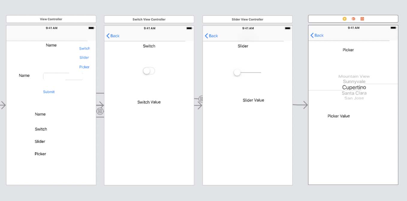 - Also include labels as Outlets for Name, Switch, Slider and Picker in the initial view controller.